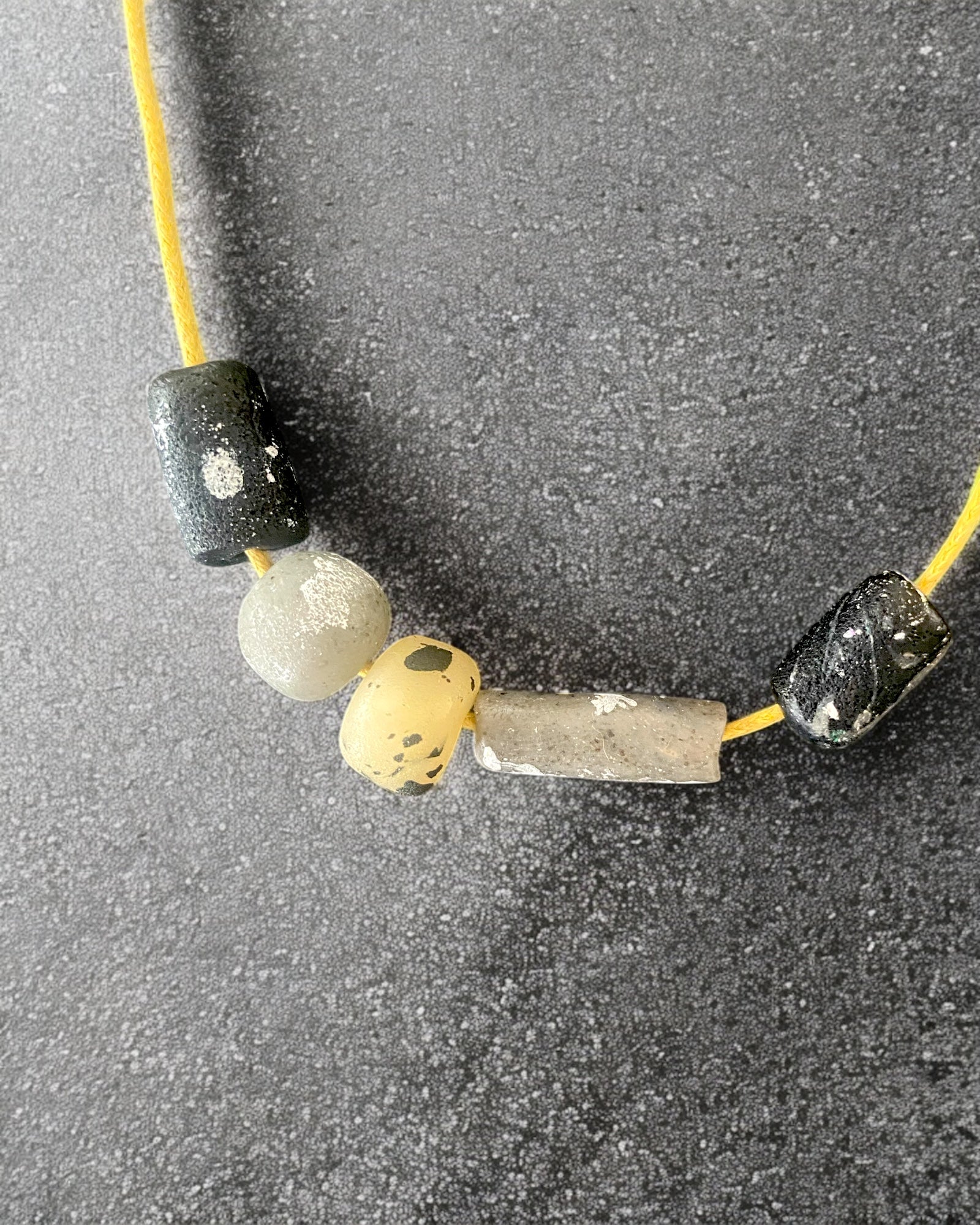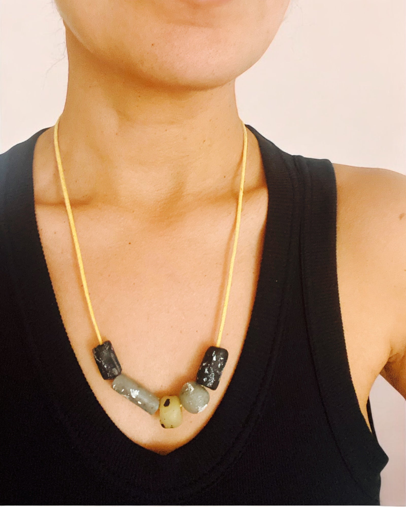 Collar de 5 piedras creadas y pintadas a mano. Arcilla granito, negra y traslúcida con pintura blanca acrílica en un hilo amarillo crema. Ajustable para usarse en mediano o gargantilla. Unisex.
