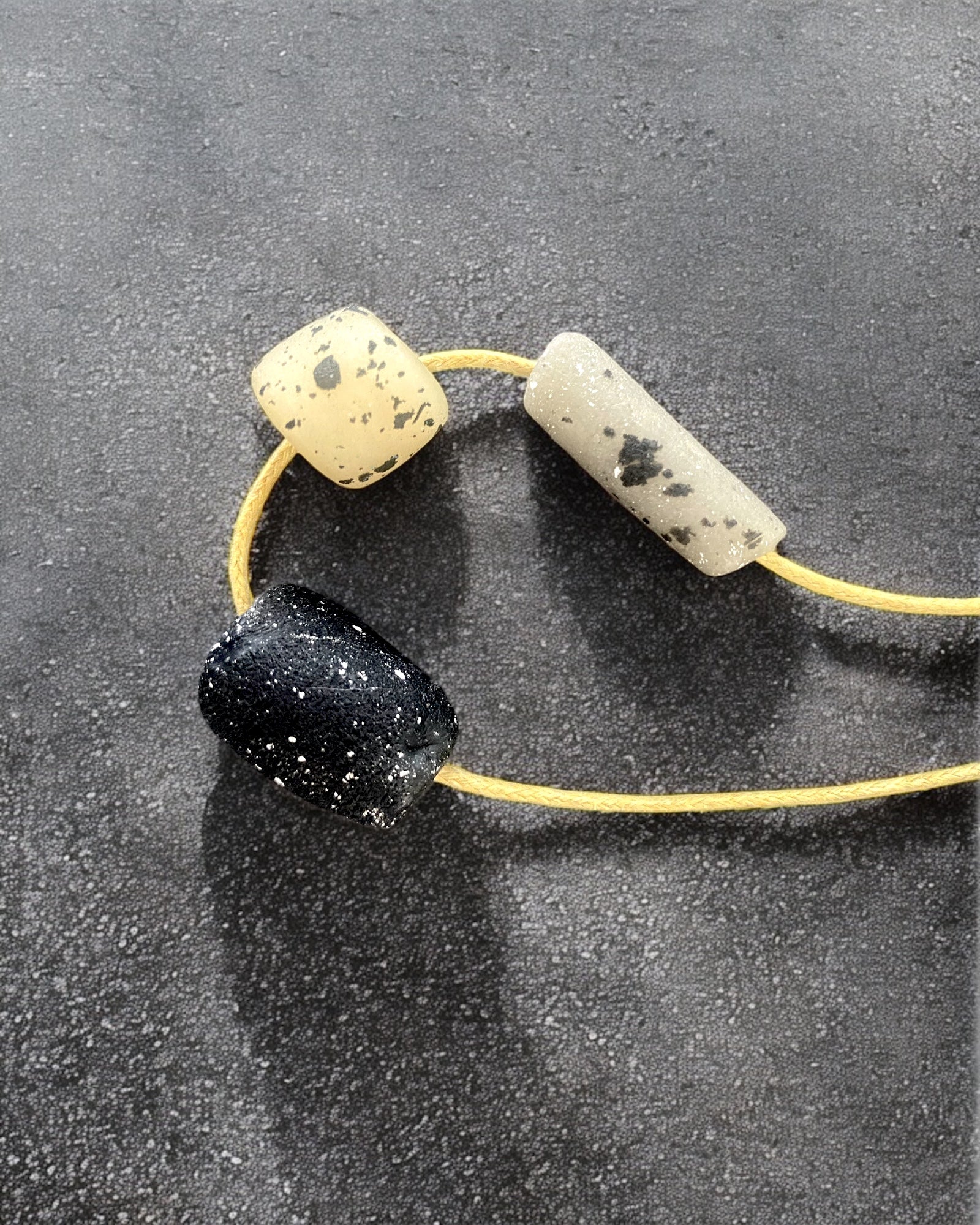 Collar de 3 piedras creadas y pintadas a mano. Arcilla granito, negra y traslúcida con pintura blanca acrílica en un hilo amarillo crema. Ajustable para usarse en mediano o gargantilla. Unisex.