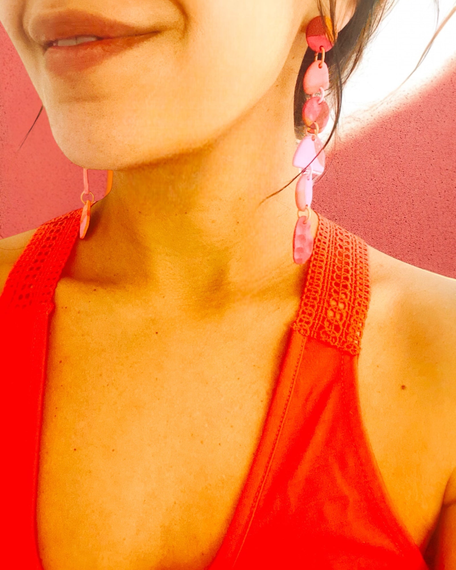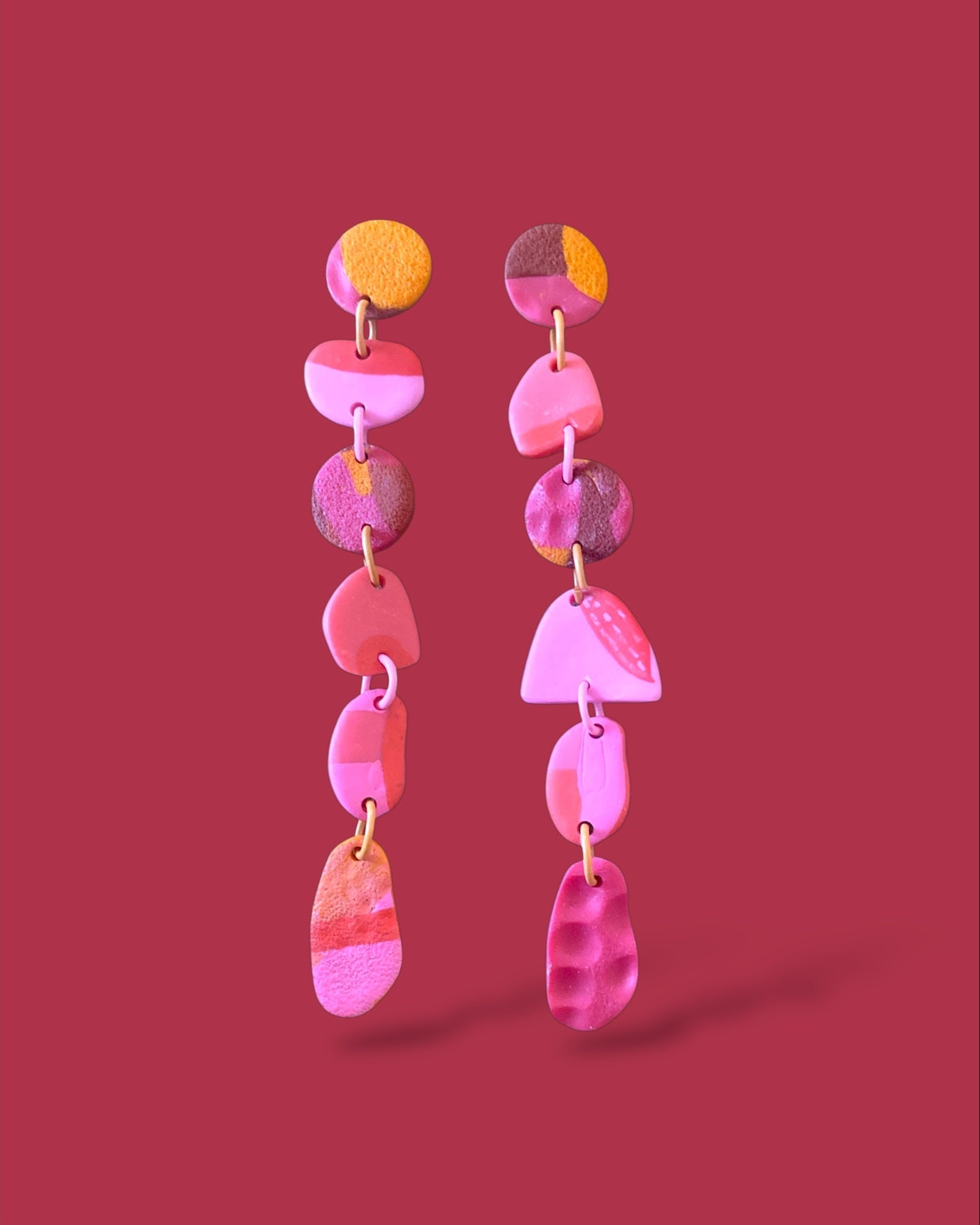 Un par muy especial de piezas pintadas a mano, con textura y mucho color. Largos y únicos, una pieza irrepetible de esta colección.